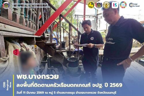วันพุธที่ 11 มีนาคม 2569 นายอุดมศักดิ์ ปานศรี พัฒนาการอำเภอบางกรวย มอบหมายให้ นายณรงค์ศักดิ์ พันธุ์พิทย์แพทย์ นักวิชาการพัฒนาชุมชนปฏิบัติการ พร้อมด้วยเจ้าหน้าที่สำนักงานพัฒนาชุมชนอำเภอบางกรวย ลงพื้นที่ติดตามและเยี่ยมเยียนครัวเรือนที่ตกเกณฑ์ข้อมูลความจำเป็นพื้นฐาน (จปฐ.) ประจำปี 2569 ณ พื้นที่หมู่ที่ 5 ตำบลบางขนุน อำเภอบางกรวย จังหวัดนนทบุรี โดยทางเจ้าหน้าที่ได้ดำเนินการสำรวจสภาพความเป็นอยู่ รับฟังปัญหา และความต้องการที่แท้จริงของครัวเรือนเป้าหมาย