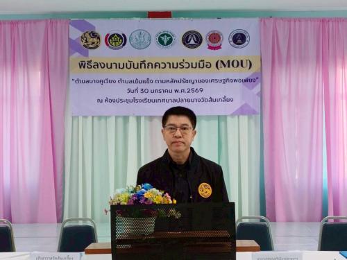 🎯 วันศุกร์ที่ 30 มกราคม 2569 ณ ห้องประชุมโรงเรียนเทศบาลปลายบางวัดส้มเกลี้ยง ว่าที่ร้อยตรียุทธภูมิ จับจิตต์ นายอำเภอบางกรวย เป็นประธาน ในการประกาศวาระ และพิธีร่วมลงนามในบันทึกข้อตกลงความร่วมมือ (MOU) “ตำบลบางคูเวียง ตำบลเข้มแข็ง ตามหลักปรัชญา ของเศรษฐกิจพอเพียง” โดยมี นายพงษ์ศักดิ์ อัจฉริยะประสิทธิ์ นายกเทศมนตรีเมืองปลายบาง นายอุดมศักดิ์ ปานศรี พัฒนาการอำเภอบางกรวย นายอภิพล ทองคำ เกษตรอำเภอบางกรวย นายนพรุจ ปิ่นทอง สาธารณสุขอำเภอบางกรวย นายนิพิฐพนธ์ วงษ์ปัน ผอ.รร.เทศบาลปลายบางวัดส้มเกลี้ยง พระครูปลัดอรรถพันธ์ เขมกาโม เจ้าอาวาสวัดส้มเกลี้ยง นางวิไล เสนีวงศ์ กำนันตำบลบางคูเวียง และนายบัญชา ยิ้มถิน ประธานเครือข่ายกองทุนแม่ของแผ่นดินอำเภอบางกรวย ร่วมลงนามเพื่อพัฒนาตำบลบางคูเวียง สู่ตำบลเข้มแข็ง ตามหลักปรัชญาของเศรษฐกิจพอเพียง